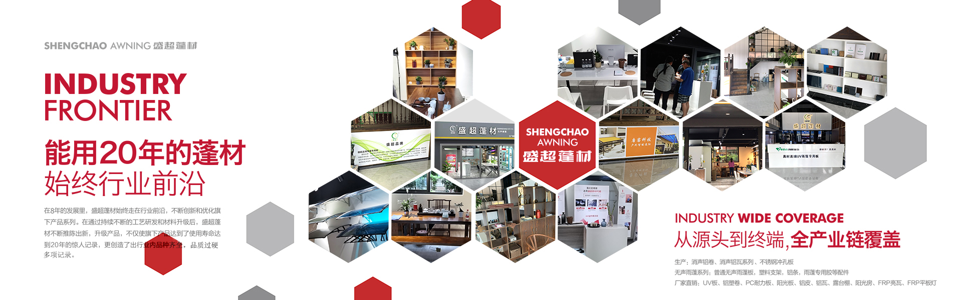 盛超蓬材是由四川超諾商貿有限公司創辦,是一家集研發、生產、銷售和服務于一體的專業雨蓬供應商。主要產品:實心耐力板,中空陽光板、多層板、蜂窩板、鋁瓦、消聲鋁瓦、不銹鋼消聲等材料的雨蓬產品。自主研發多款雨蓬,擁有自己的專利和檢測報告。其中明星產品新型組裝式雨蓬,擁有組裝簡便,美觀耐用、抗噪音,性價比高等優勢,多項檢測指標領跑同行業。受到了市場和經銷商的高度認可。 公司自成立至今,從銷售到研發再到生產,已經過了3次跨越式的發展。2017年已成為四川雨蓬行業內庫房面積大,員工多的一家公司。產值每年以平均20%的速度快速增長??梢哉f客戶是我們的老師,和他們合作使我們得到很多的學習機會來提高自身的技術水平和管理水平,是我們生產和發展的動力。